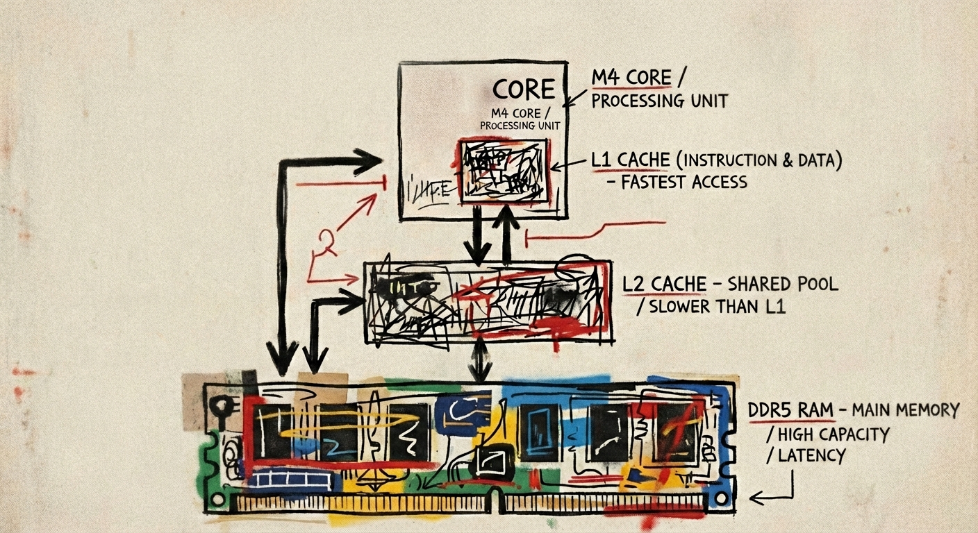 - M4's actual latency numbers: L1 (~0.7ns) → L2 (~1.5ns) → Main memory (~6.4ns)