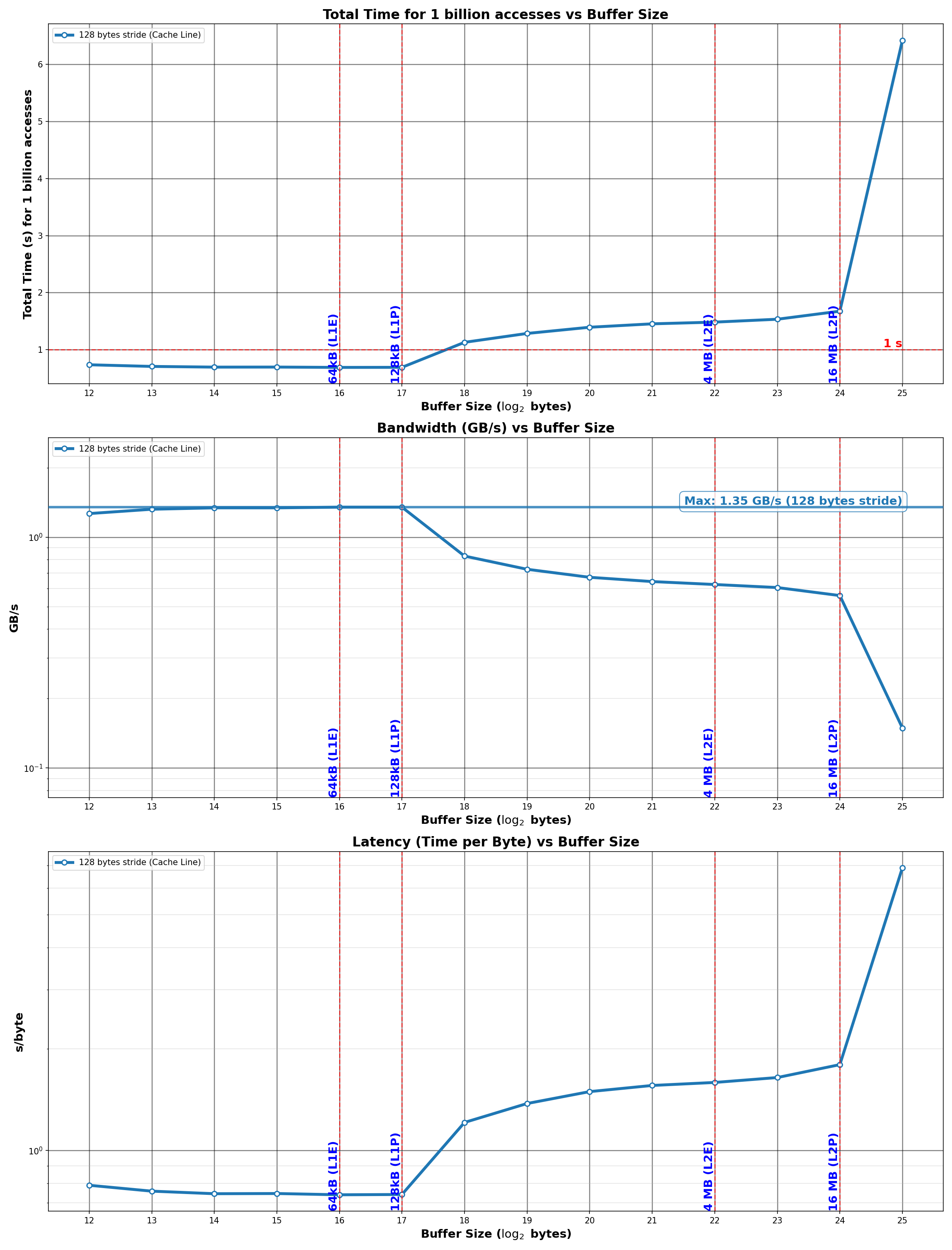 - Strides ≤128 bytes: Similar latency (accessing within single cache line or adjacent lines)