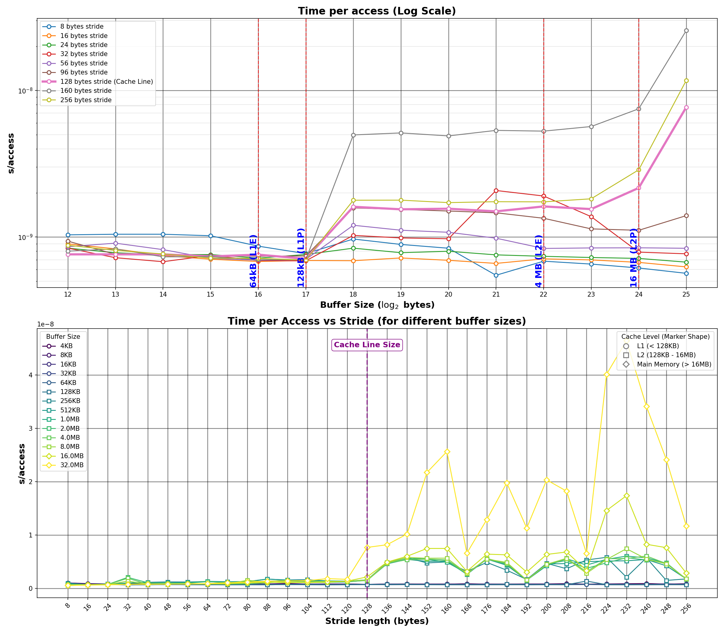 - Strides >128 bytes: Latency increases (each access touches a new cache line)